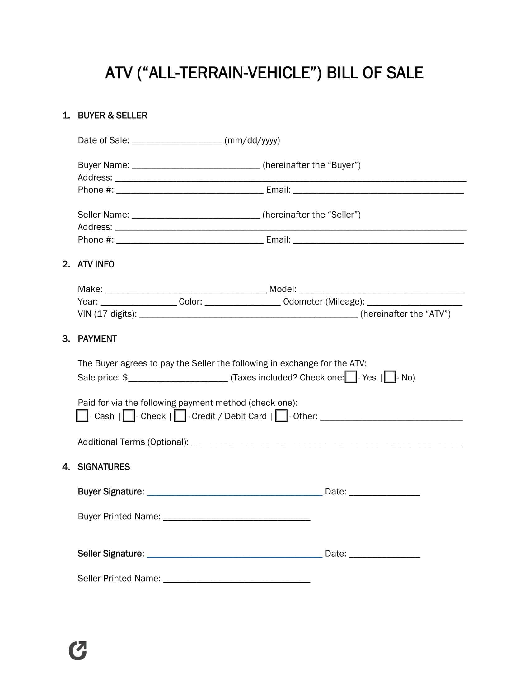 An all-terrain vehicle (ATV) bill of sale is a legal file used to tape-record the deal of an ATV from vendor to customer.